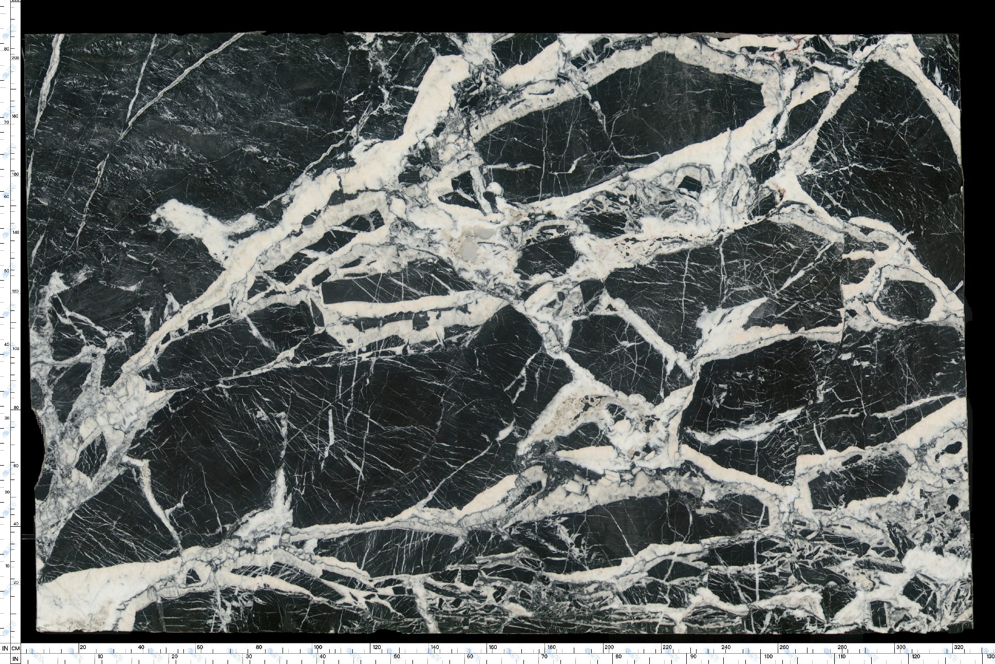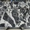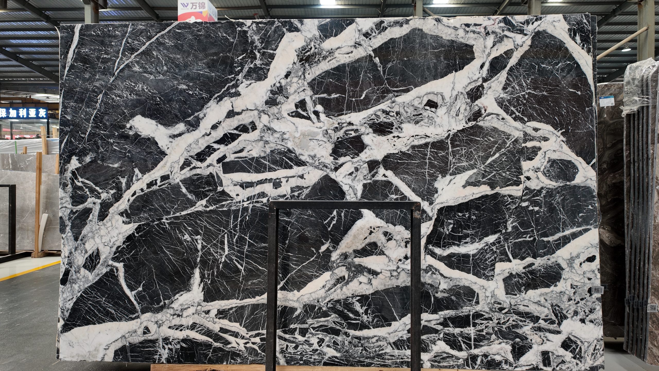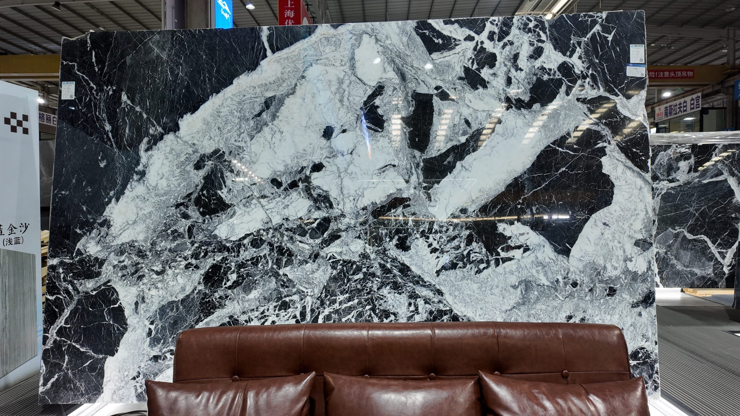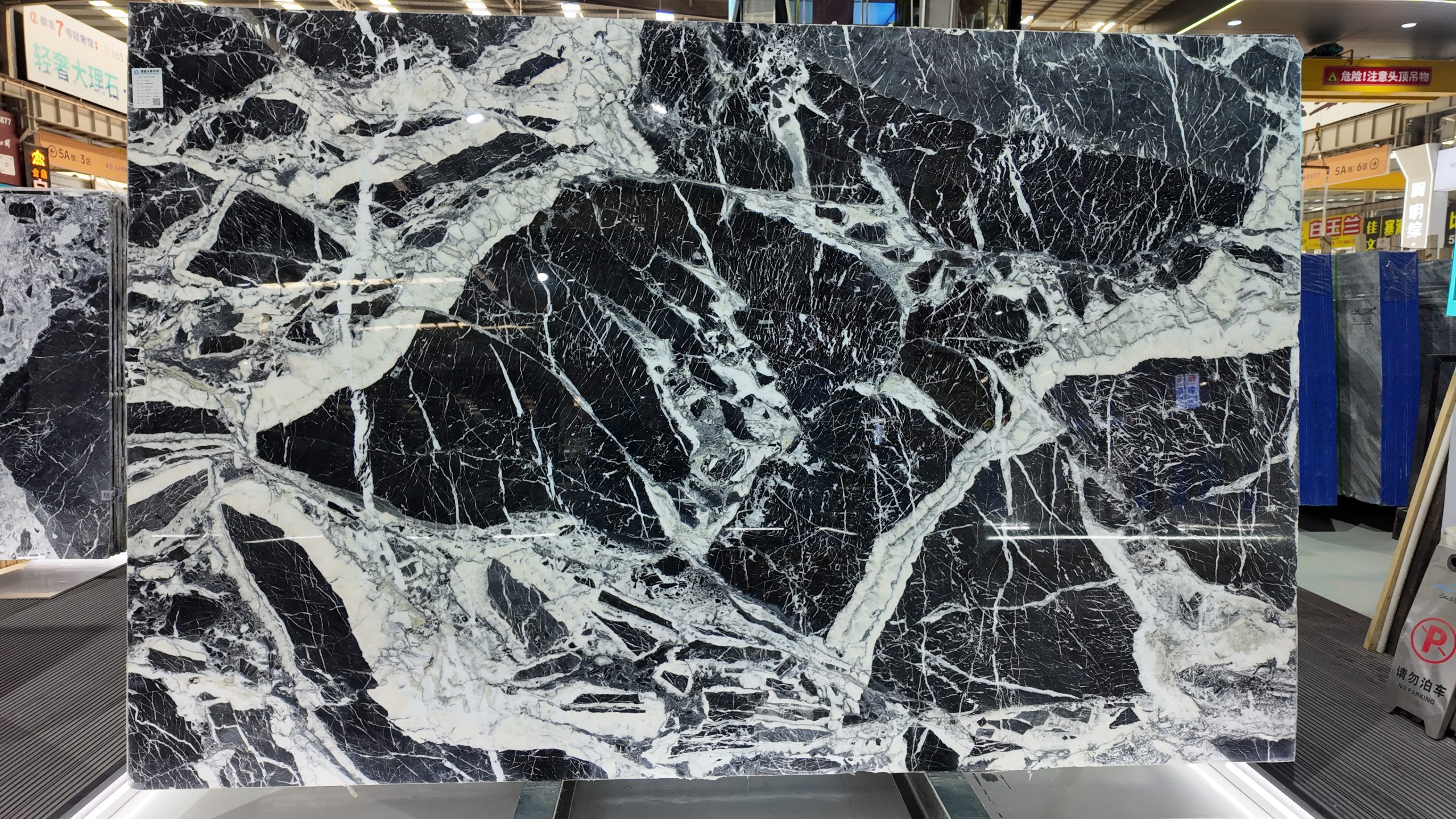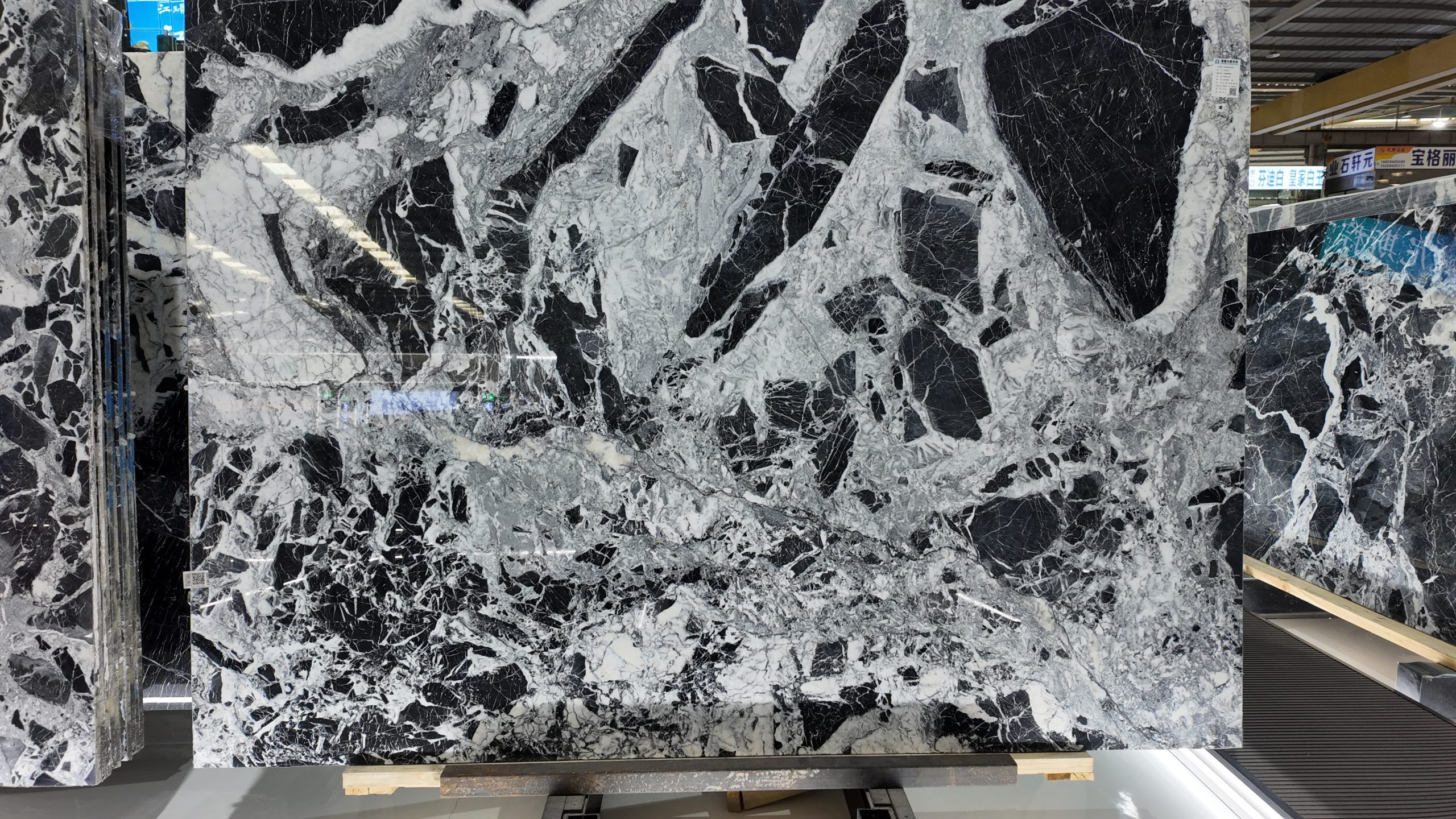 Displayed in a showroom alongside other luxury stones such as “Fish Belly White,” “Large Flower White,” and “Fish Belly Gold,” and accompanied by clear signage, it reflects strong brand presence and quality control. The bold black-and-white contrast and unrepeatable veining make it ideal for high-end interiors—lobbies, walls, or flooring in luxury homes and five-star hotels—instantly elevating the ambiance and prestige of any space.