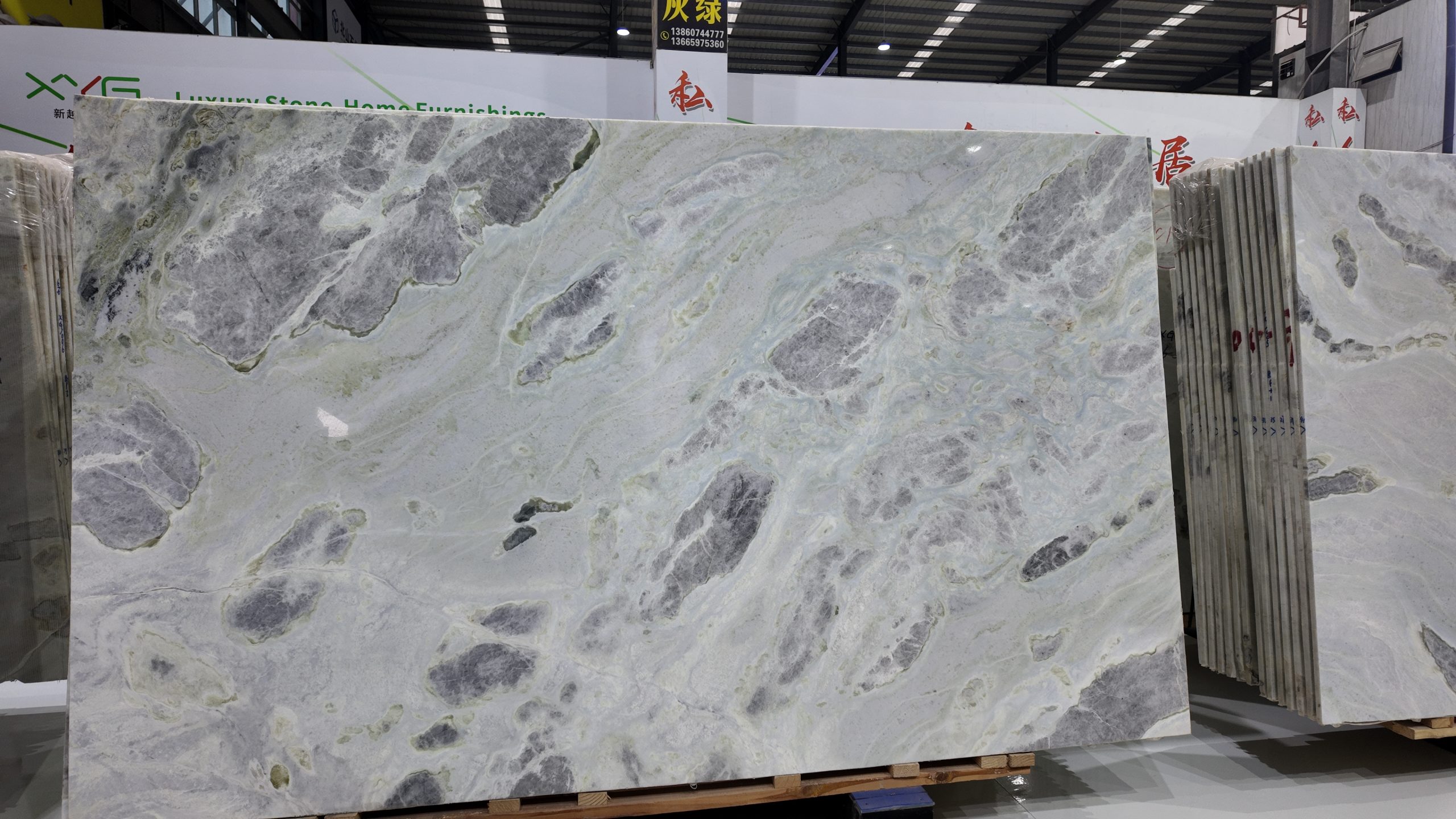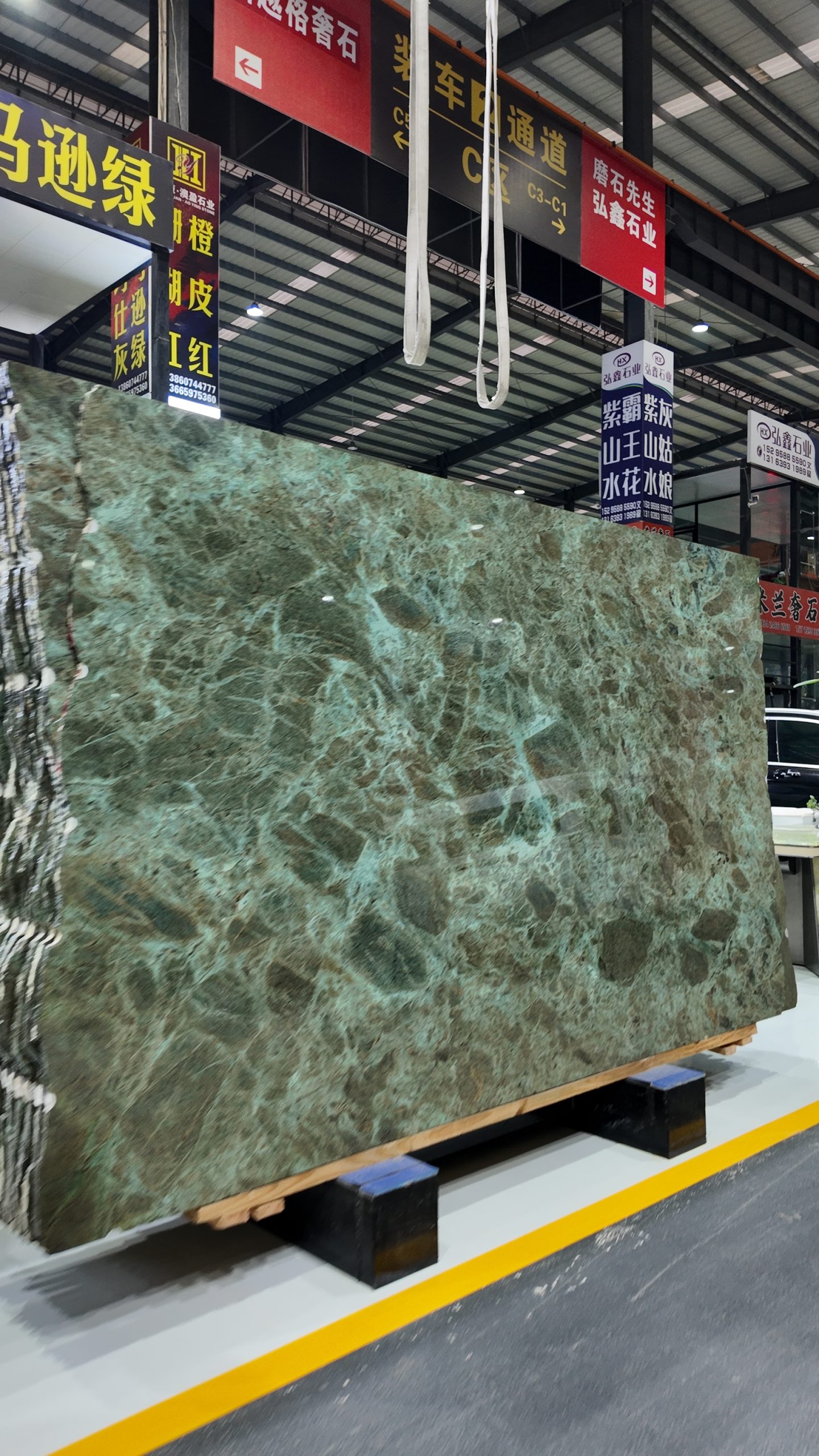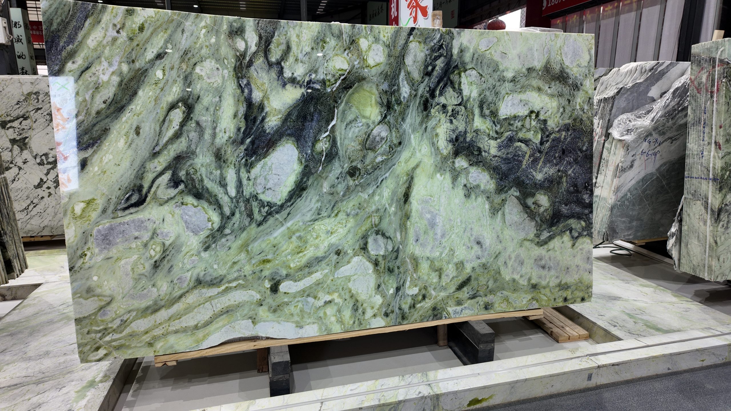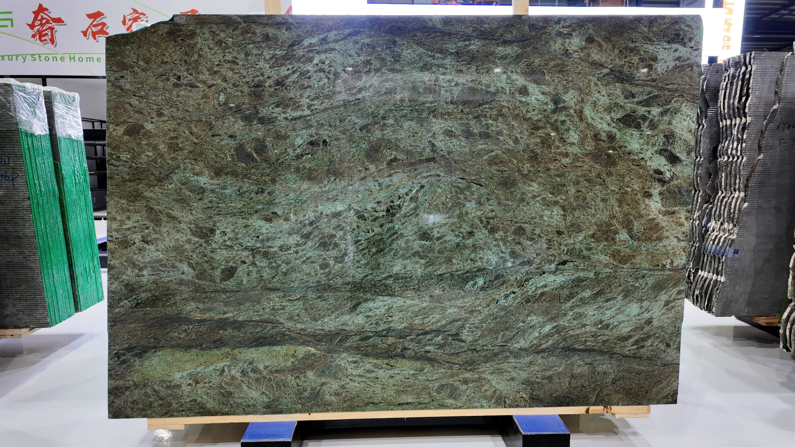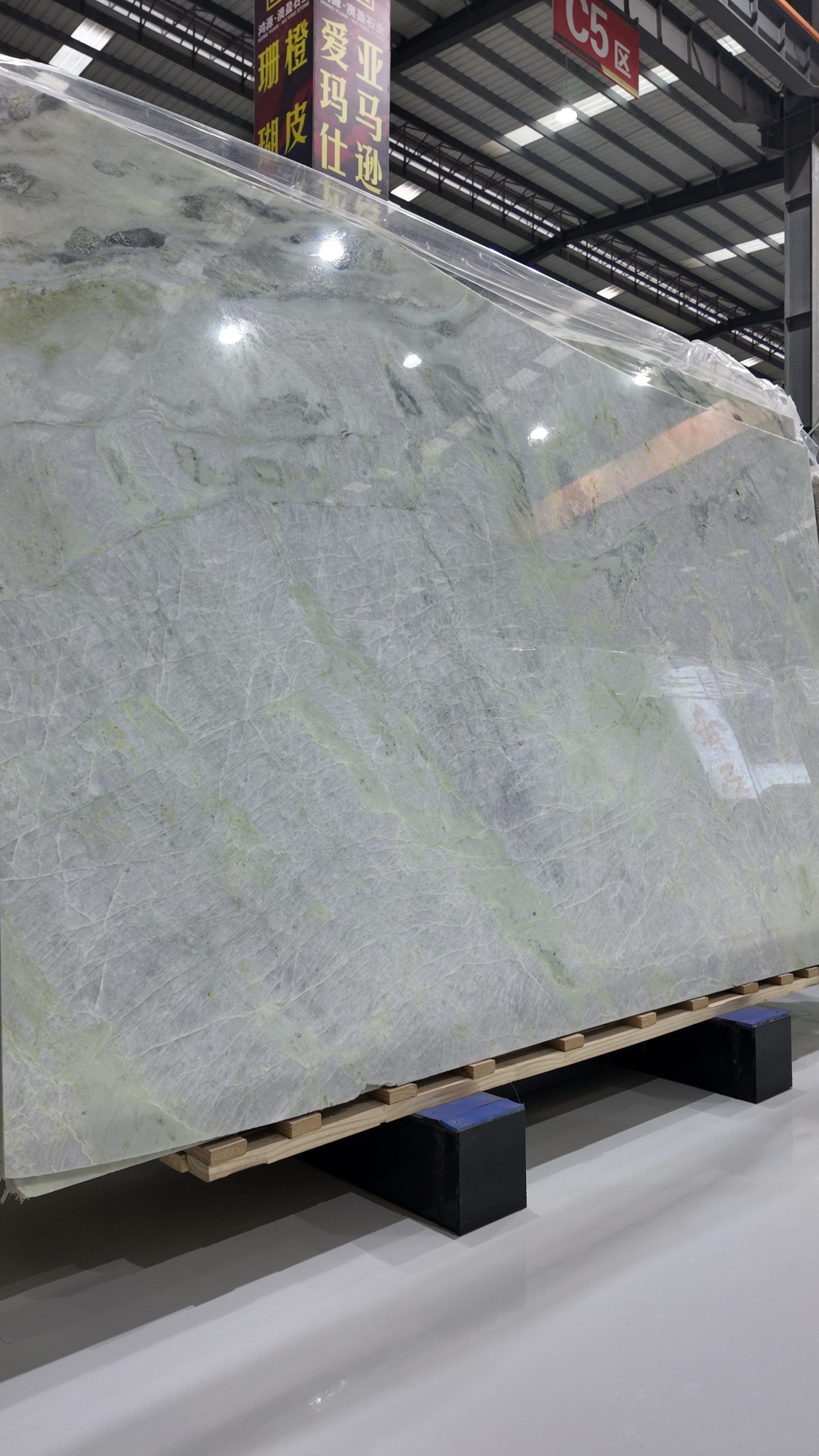 The slab stands tall in vertical form, resting horizontally on a light-colored wooden pallet, secured at both ends by blue square pads for stable display and transport. In the background, other luxury stones are wrapped in transparent plastic film and reinforced with green straps, neatly stacked against the wall, reflecting professional storage and quality control. Even lighting across the showroom highlights the richness of color and precision of detail.