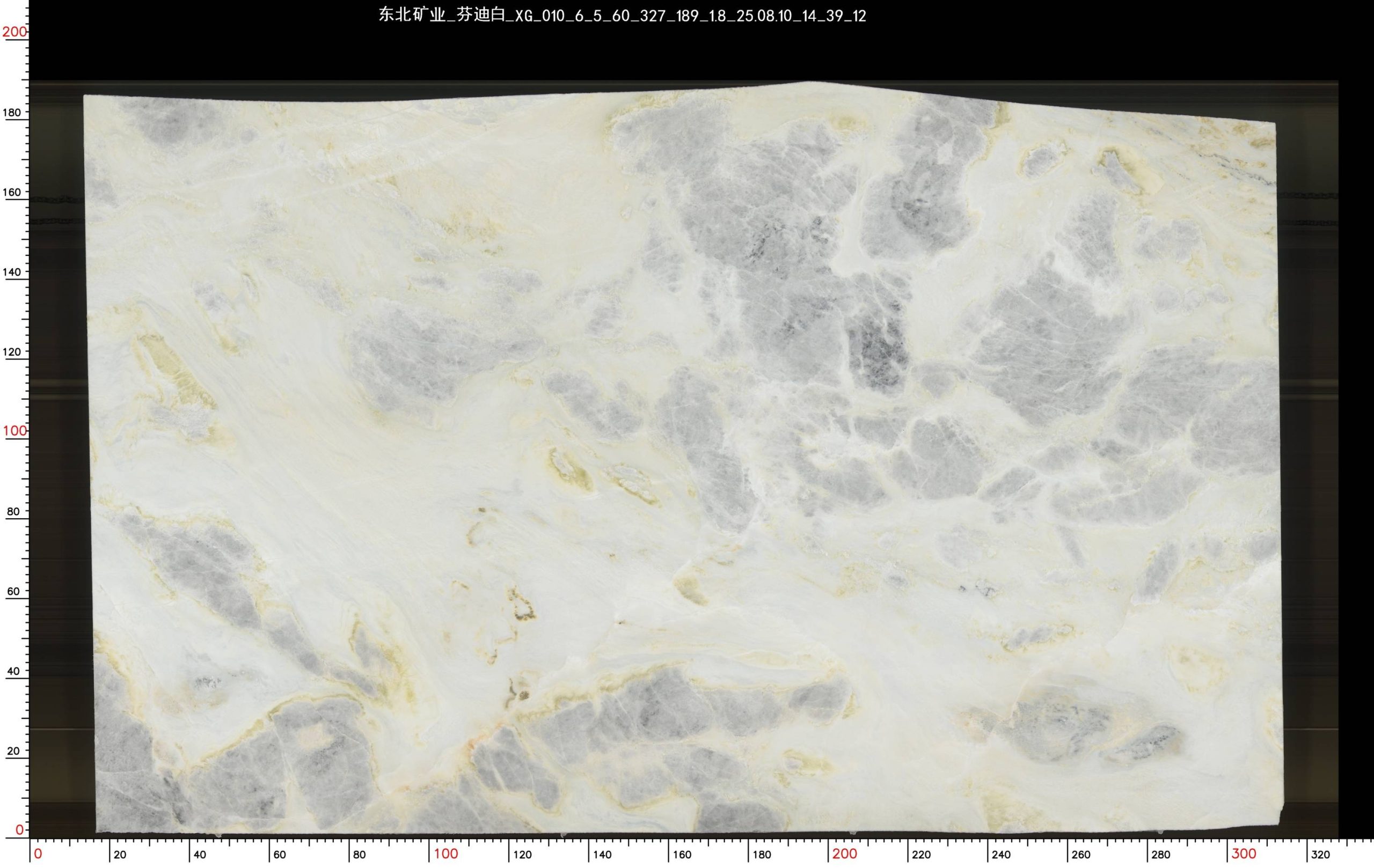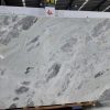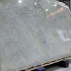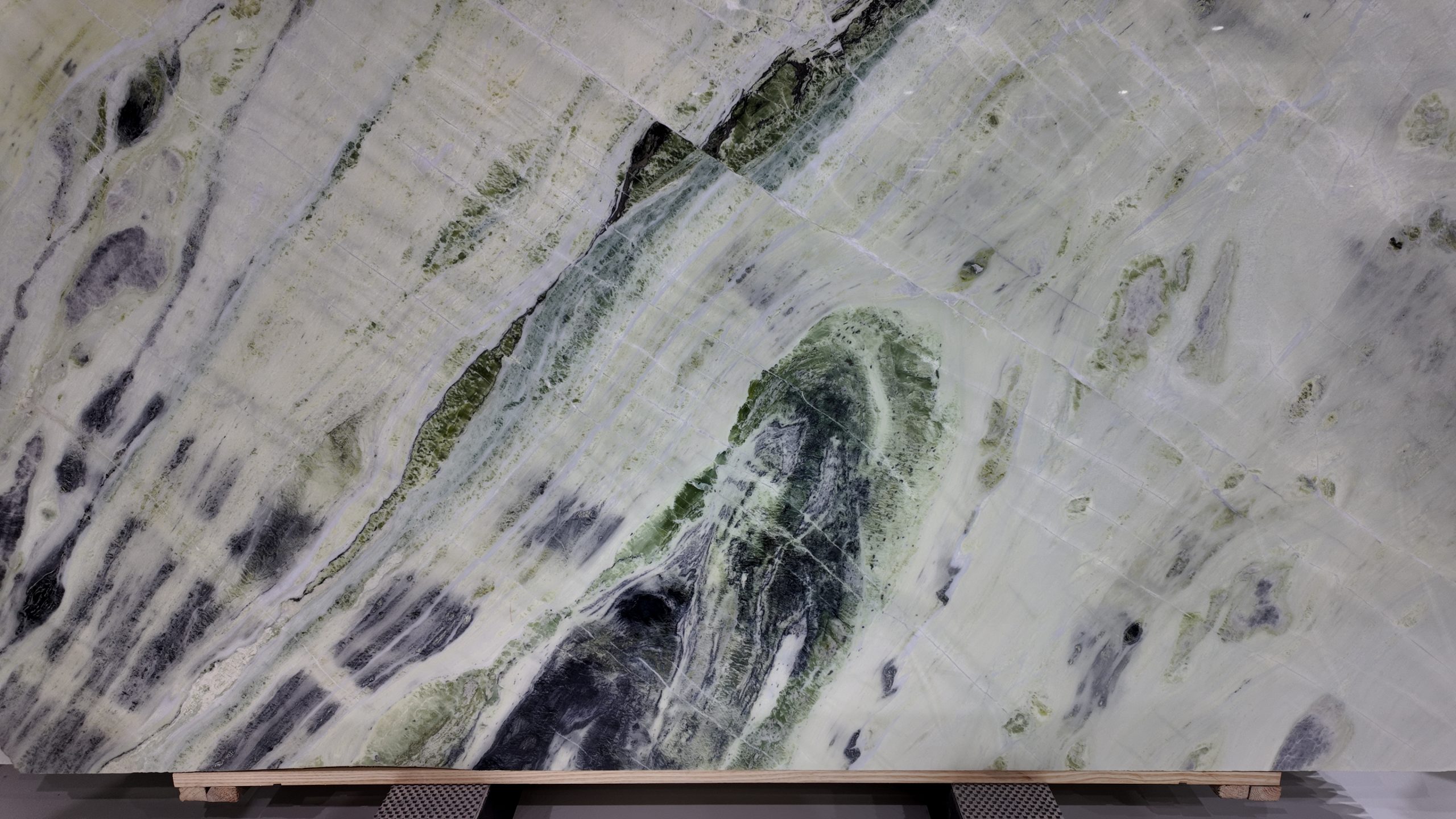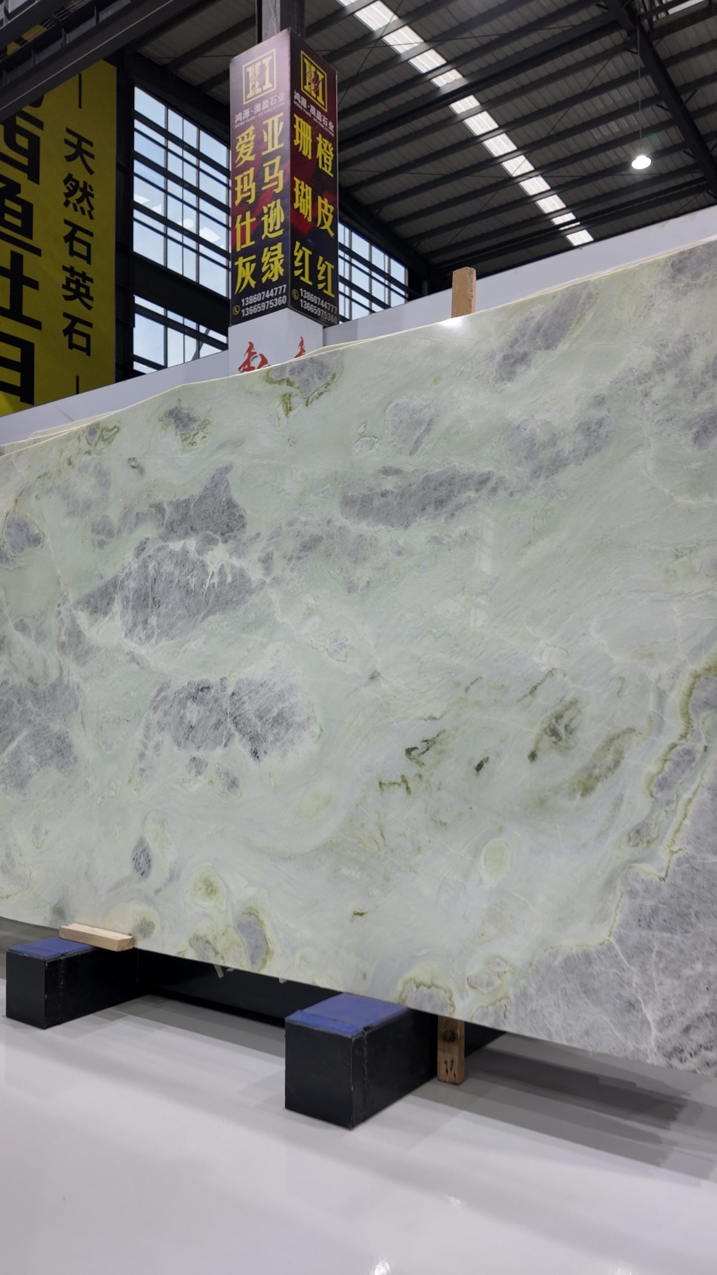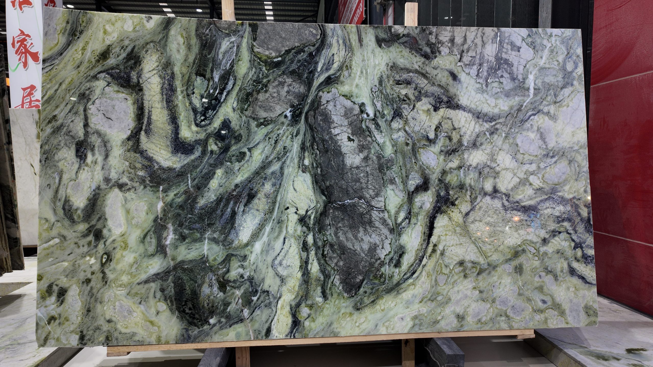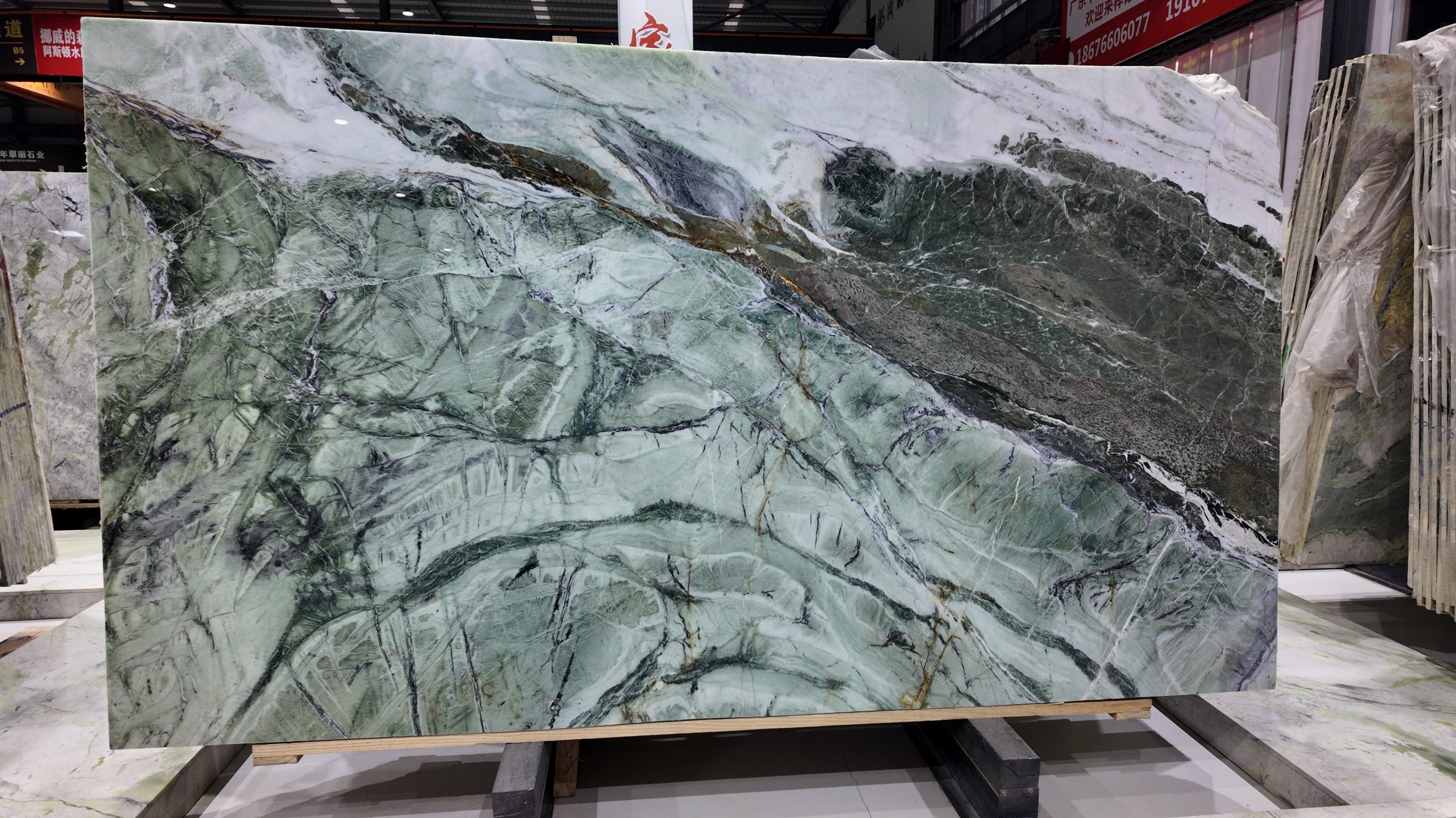 The slab stands tall in vertical form, resting horizontally on a light-colored wooden pallet, secured at both ends by blue square pads for stable display and transport. In the background, other luxury stones are wrapped in transparent plastic film and reinforced with green straps, neatly stacked against the wall, reflecting professional storage and quality control. Even lighting across the showroom highlights the richness of color and precision of detail.