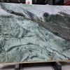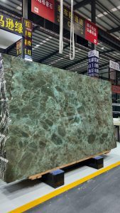 In real-world applications, Bvlgari Green Marble can serve as a full-scale feature wall, enhanced with vertical golden trims to instantly elevate a space’s sense of luxury. Its deep yet dynamic veining harmonizes beautifully with off-white furnishings and metal sculptures, while recessed lighting casts a soft glow and polished floors reflect ambient light—together creating a high-end, atmospheric interior imbued with artistic presence.
